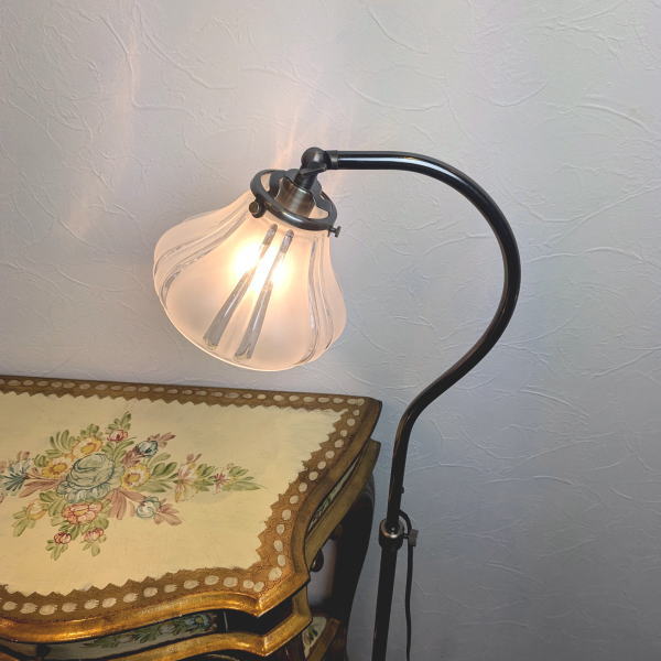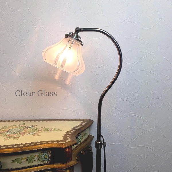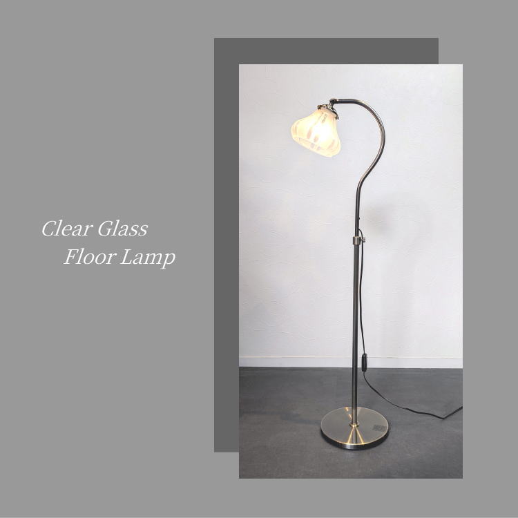 優雅なスワン型灯具に、クリアガラスとフロストガラスを組み合わせたシェードが特徴のフロアライトです。